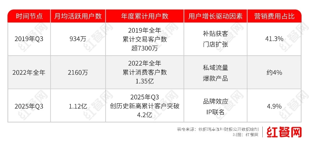 这些举措成效显著,瑞幸咖啡的营销费用占比从2019年Q3的41.3%降至2025年Q3的5%以内,取得了营收、门店数、利润、盈利能力(利润率)等各项指标高速且健康的成长。对很多餐饮品牌来说,关于如何解决日益攀升的营销费用占比问题时,是完全可以“抄作业”的。