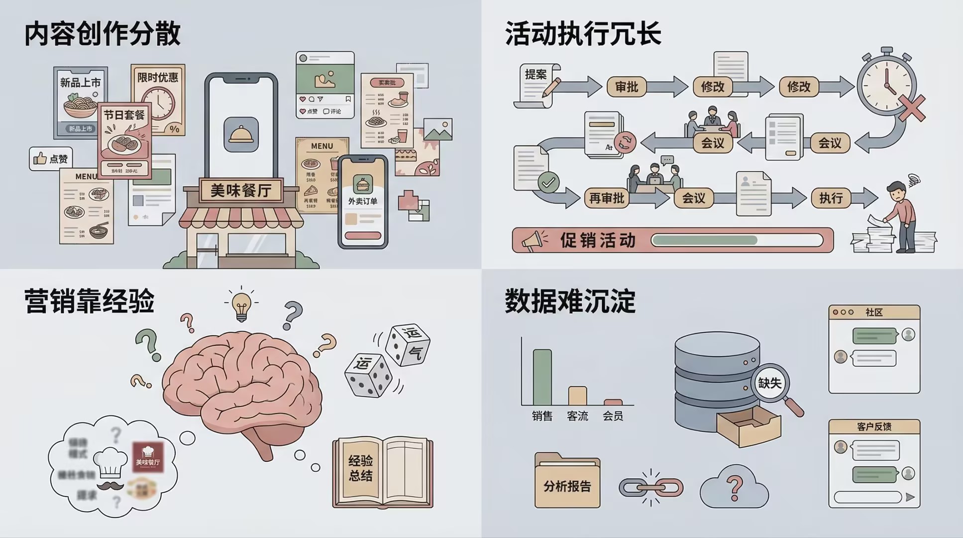 从品牌总部到门店一线,餐饮营销的复杂度往往比表面看起来更高,常见问题主要集中在以下几个方面。
